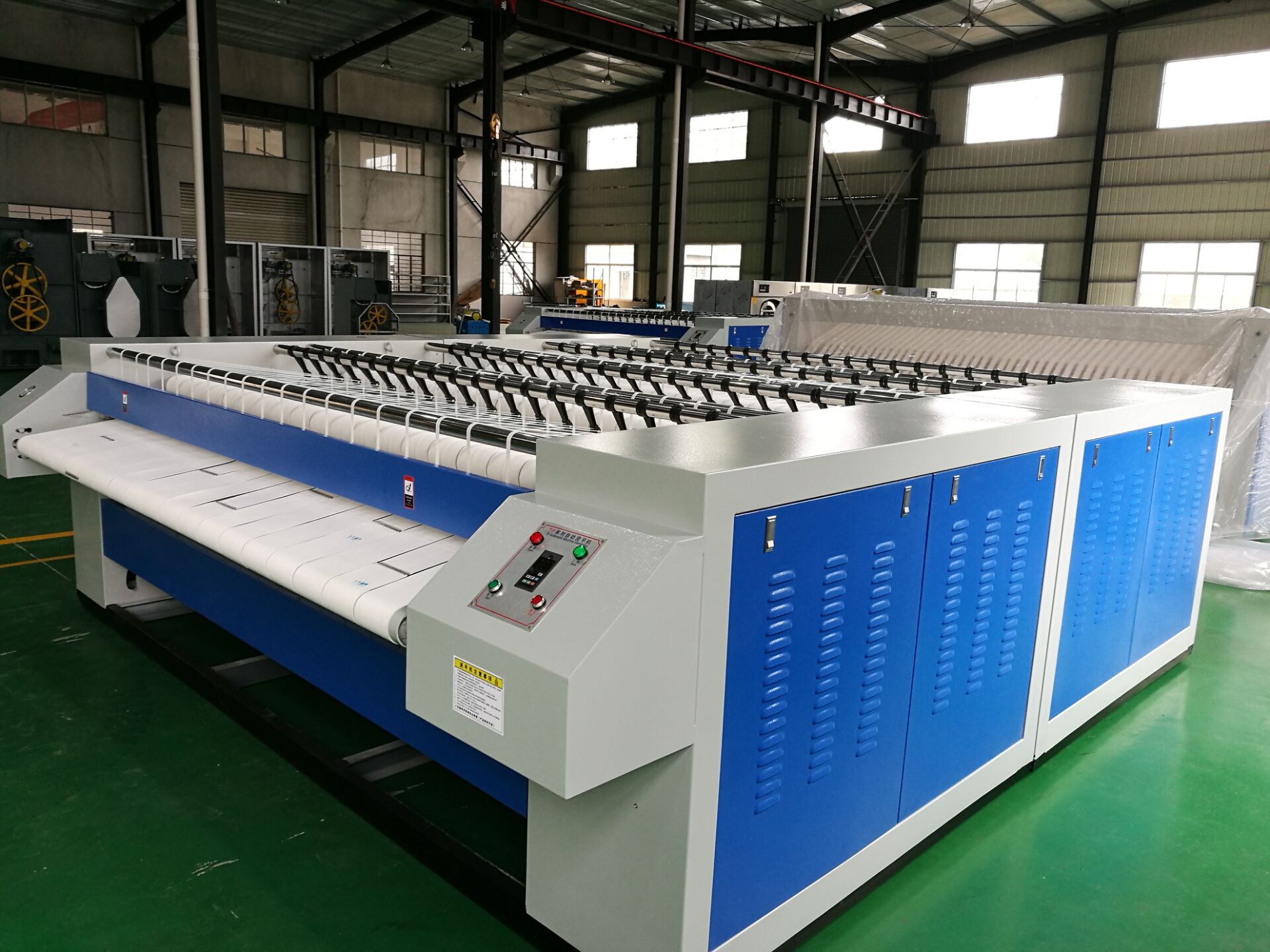工業(yè)燙平機(jī)是我廠自行設(shè)計(jì)制造的。它主要用于各種成片布料、毛巾、床單的熨燙、整形烘干,廣泛適用于賓館、部隊(duì)、學(xué)校、醫(yī)院及生產(chǎn)毛巾、床單的廠家等企事業(yè)單位。